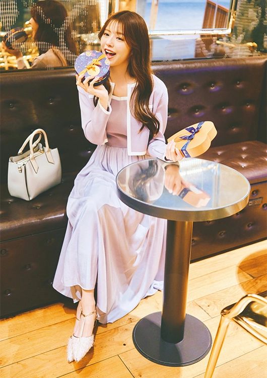 ラベンダーカラーのセットワンピースが甘さたっぷりでエレガントな気分に!休日のおしゃれなカフェやショッピングの予定にもぴったり。バッグや靴の色もトーンをそろえれば失敗なし◎