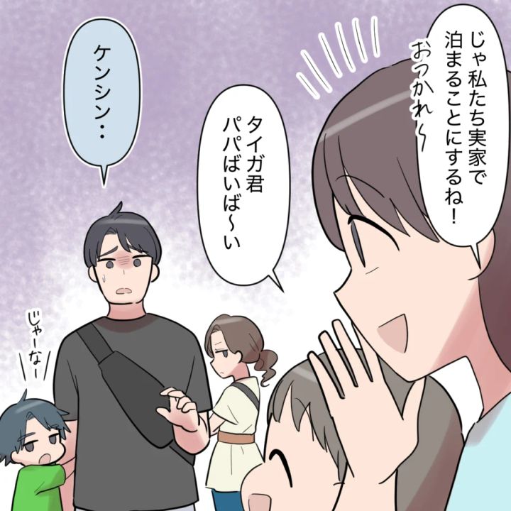 けれど、この状況を選んだのは他でもないシンジ自身です。「じゃ、私たち実家で泊まることにするね!」そう声をかけると、シンジは「ケンシン・・・」とつぶやき、寂しそうな表情を浮かべました。