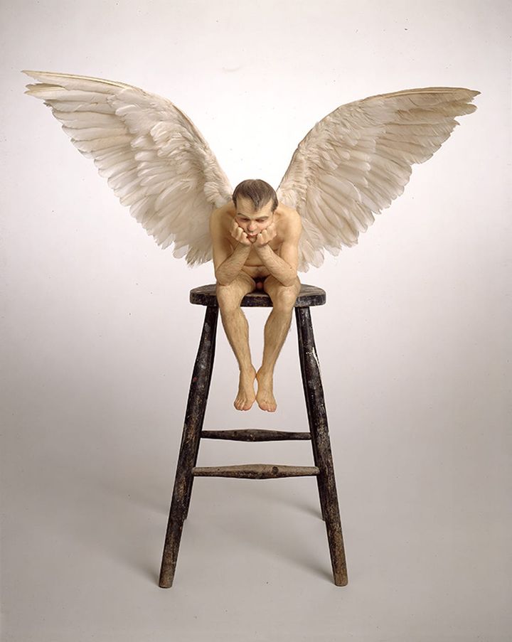 初期の代表作《エンジェル》は、ミュエクが脚光を浴びるきっかけとなった「センセーション:サーチ・コレクションのヤング・ブリティッシュ・アーティスト」展のニューヨーク巡回(ブルックリン美術館、1999~2000年)でも展示された作品。ミュエクがロンドンのナショナル・ギャラリーで、18世紀のイタリアの画家ジョヴァンニ・バッティスタ・ティエポロによる《ヴィーナスと時間の寓意》を見たことをきっかけに制作したもので、ヴィーナスと共に描かれている“時間”を表す翼を持つ年老いた男性の人物像に想を得たといいます。ミュエクの作品では、背中に大きな翼を持つ男性が椅子に腰かけ、俯いて物思いにふけっている姿はどこか悲しげ。一般的な天使のイメージとは異なる、ミュエクらしい表現を感じられる作品です。