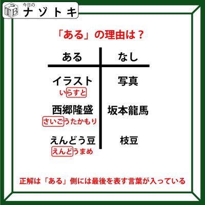 「ある」側には、どの言葉にも「最後」を意味する言葉が含まれておりました。「イラスト」なら「ラスト」、「さいごうたかもり」なら「さいご」、そして「えんどう豆」なら「えんど(エンド)」です。確かにどれも「最後」という意味がある言葉ですね。というわけで正解は「ある」側には最後を表す言葉が入っている。でした。いかがだったでしょうか?