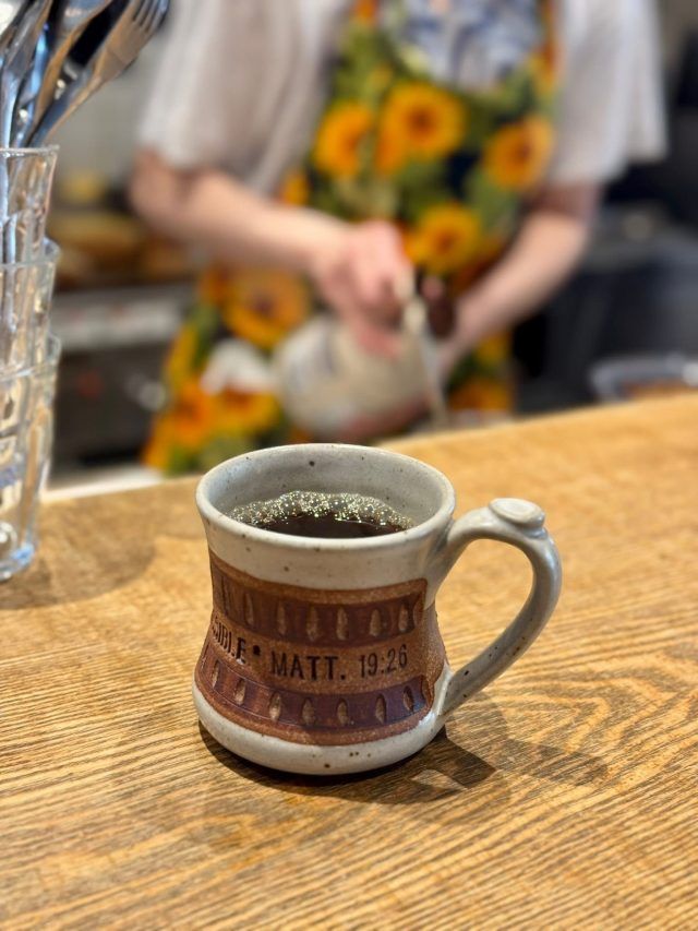 食事が出来上がるまでの間、まずはコーヒーをいただきます。 分厚いマグカップがなんともアメリカン。 コーヒーはセルフで大きなポットから注ぎます。 おかわり自由なのがうれしいですね。