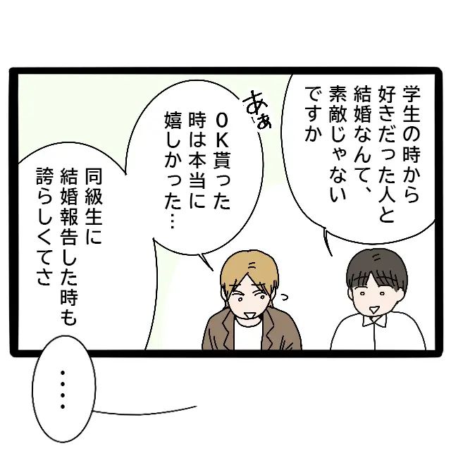 「学生の時から好きだった人と結婚なんて、素敵じゃないですか」隆明がそう言うと、兄は懐かしそうに目を細め、「あぁ、OK貰った時は本当に嬉しかった・・・同級生に結婚報告した時も誇らしくてさ」と当時を振り返りました。すると、隆明は何か思うところがあるのか、ふと考え込むような表情を浮かべます。