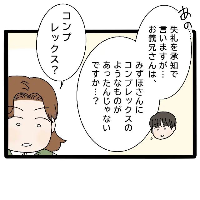 隆明は少し言いづらそうにしながら、「あの、失礼を承知で言いますが・・・お義兄さんはみずほさんにコンプレックスのようなものがあったんじゃないですか?」と、おずおずと切り出しました。隣にいたよっちゃんは思わず「コンプレックス?」と聞き返します。