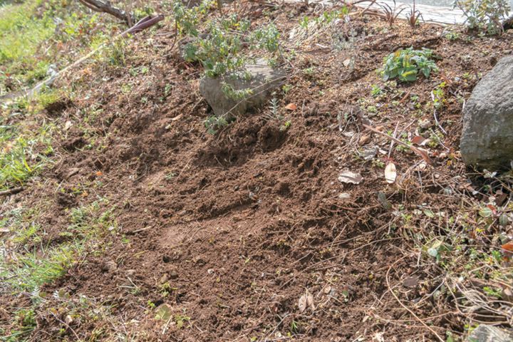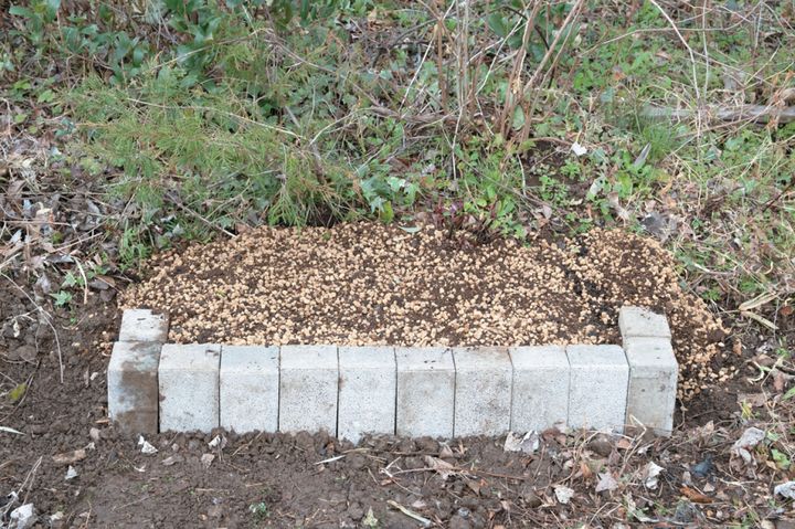 地植えする場所を決めたら雑草を取り除き、スコップでブロックを埋めるために土を6cm ほど掘り起こす。