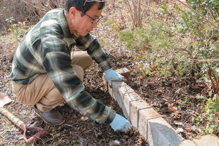 枠組みがしっかりと安定したら、新しい土を入れる。仕上げに、花壇の表面が平らになるようていねいに土をならして整える。