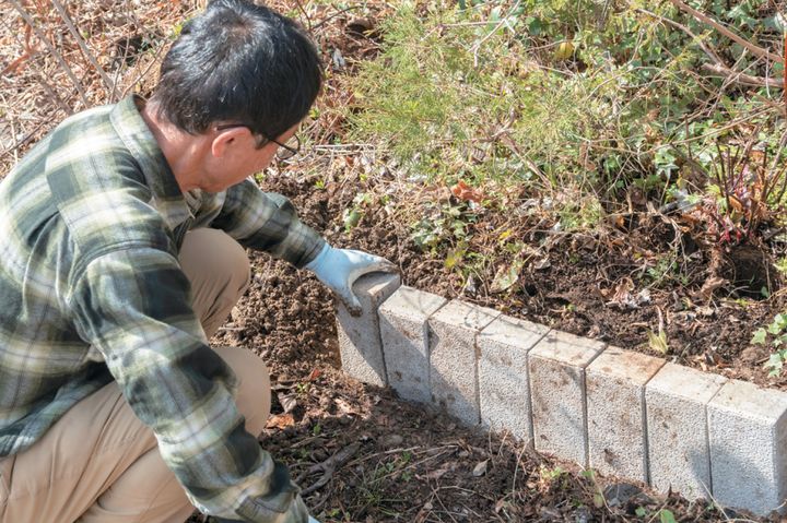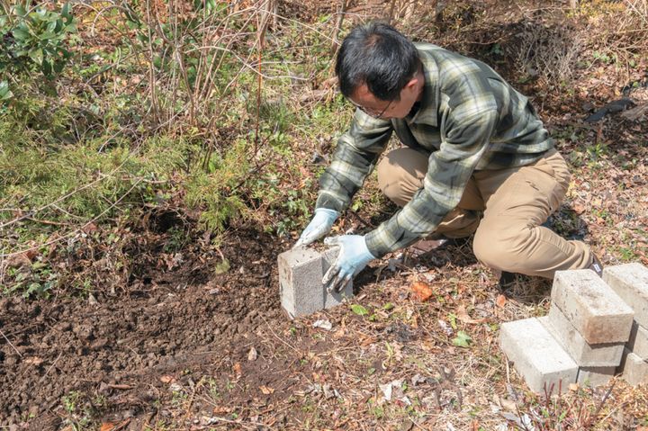 ブロックの表側に土を寄せ、しっかりと押し込むようにして固定する。同様に、裏側もしっかりと土で固めて安定させる。