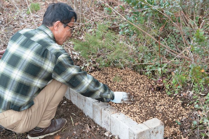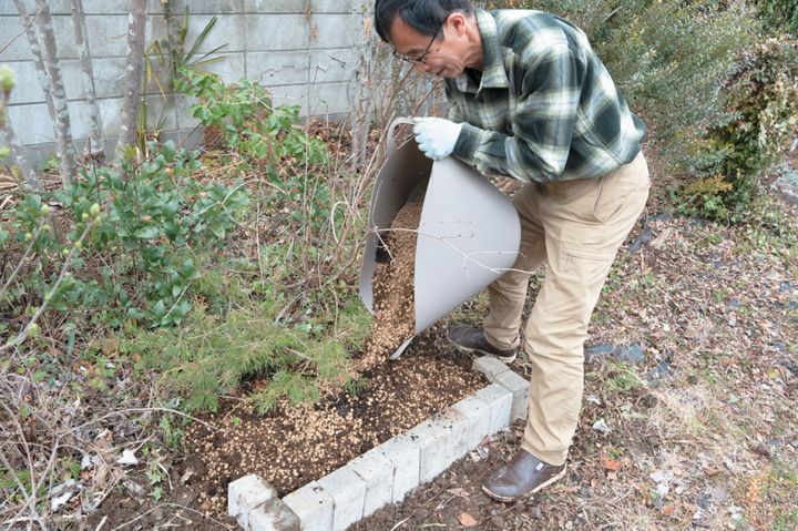 植えつけ場所が決まったら、除草し、新しい培養土と消石灰を均一に散布。土としっかりなじませるように混ぜ込む。