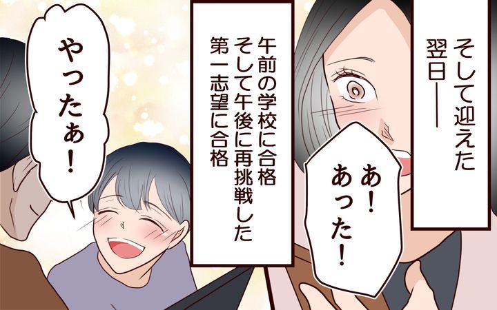 しかし祈るように迎えた翌日、息子が再挑戦した第一志望に合格…! 私は自分のことのように嬉しくて、そしてホッとしたのですが…。その直後夫から届いたメールには、「次は俺たち家族のことだな」と書かれていて!?