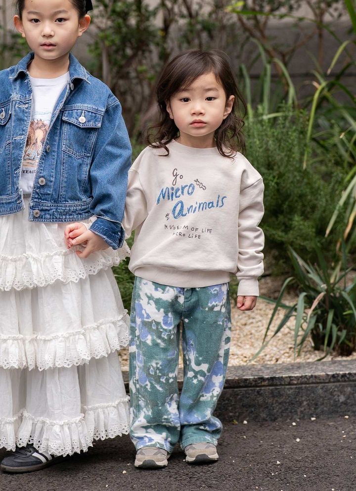海外ブランド服でつくるカジュアルコーデは、大人顔負けのこなれ感。ロゴトップスとマーブル柄ボトムスの色合わせにもワクワク♪