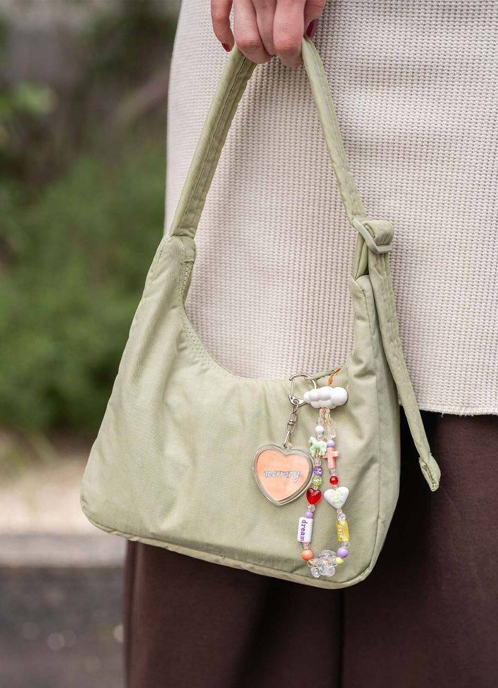 『バグー』のピスタチオグリーンのバッグで、春コーデに爽やかに彩って。カラフルなチャームを添えて、遊び心もたっぷり♪