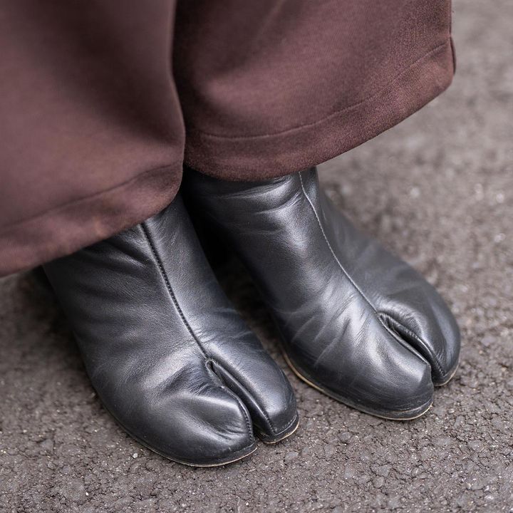 足元はタビシューズでモードに引き締め。きつくならないよう、ボトムスから少し覗かせたバランス感はお見事!