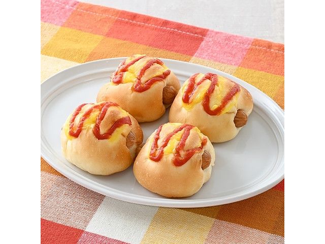 ミニウインナーを包んだ生地に、ケチャップとからしマヨドレッシングをトッピングした、惣菜パンの4個入りです。