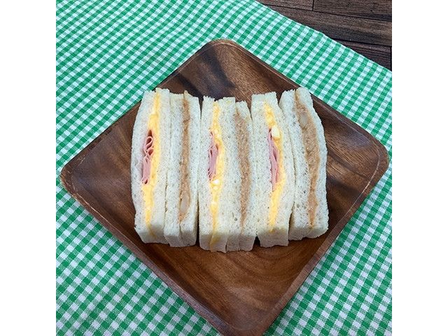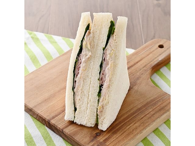 ハム&たまごとツナポテトサラダの組み合わせのサンドイッチです。食べやすいサイズでランチや軽食に最適な商品です。 宮崎・鹿児島で販売