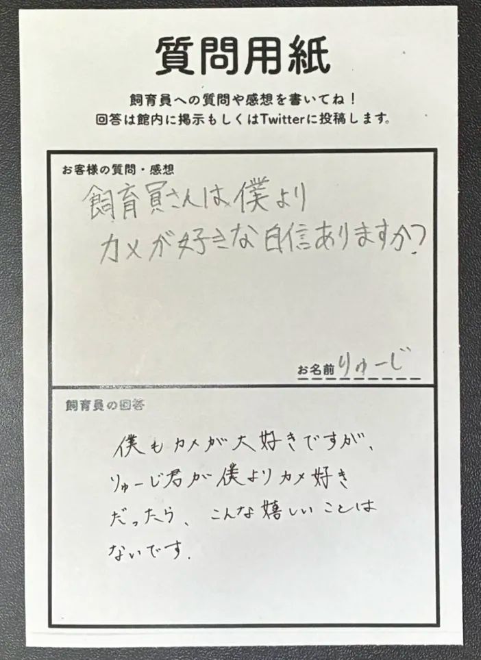 「ぼくよりカメが好きな自信はありますか」というちょっぴり挑戦的な問いに対し、「ぼくもカメが大好きですが、りゅーじ君がぼくよりカメが好きだったら、こんなに嬉しいことはないです」と回答した飼育員。