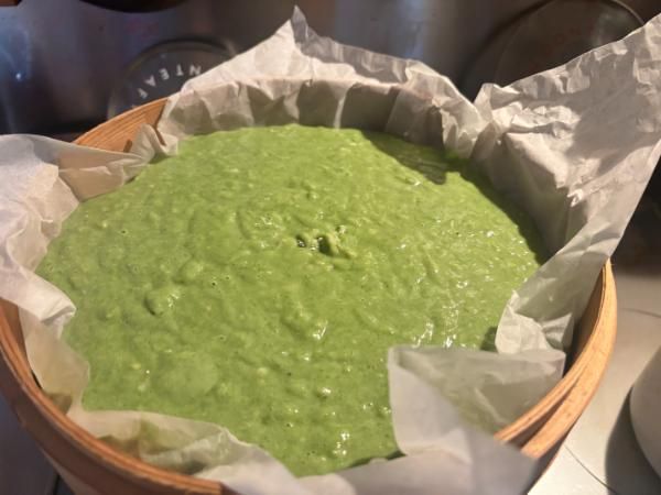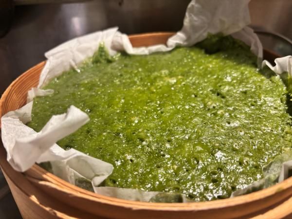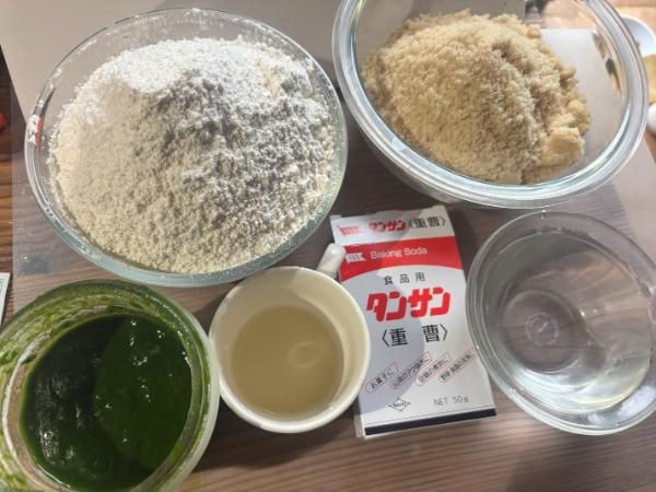 ・よもぎ(あく抜きして絞ったもの)…60g ・水…300g ・薄力粉…375g ・三温糖…300g ・重曹…10g ・酢…大さじ1