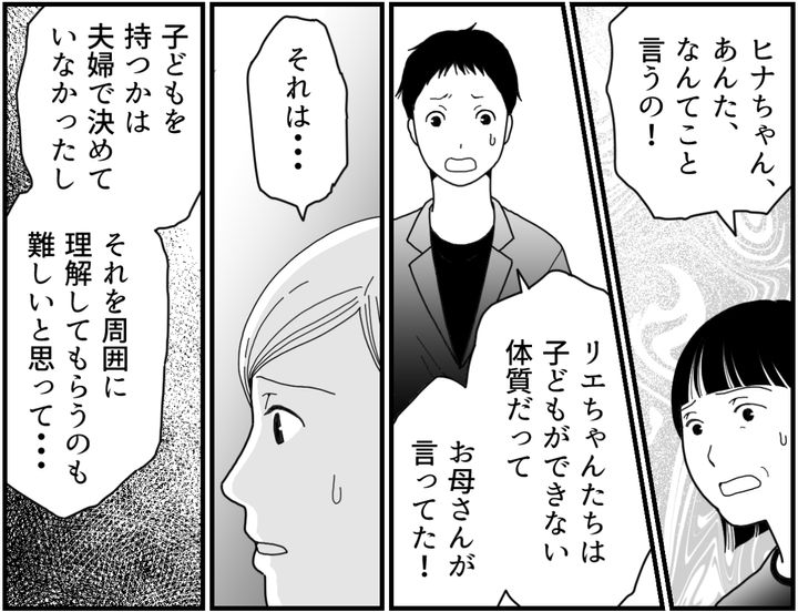 私(リエ)は、夫のヤスタカと2人暮らしでした。義両親はすでに他界し、義実家にはシングルマザーである義妹ヒナちゃんが子どもたちと暮らしています。私たち夫婦は子どもを持つことに積極的ではなく、周囲には「子どもができにくい体質」だと思われていました。そんなある日夫が突然亡くなり、しかも葬儀の後で妊娠が判明したのです。そのことを四十九日に話すと、ヒナちゃんから「お兄ちゃんの子のはずない!」と言われてしまって……?