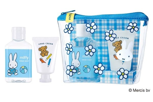 「ミッフィー ハンドケアセット カモミールの香り」は、クリアポーチに、アロエベラ葉エキス配合のミニハンドソープ(70mL)とシアバターとワセリン配合のハンドクリーム(20mL)が1個ずつ入ったセットです。
