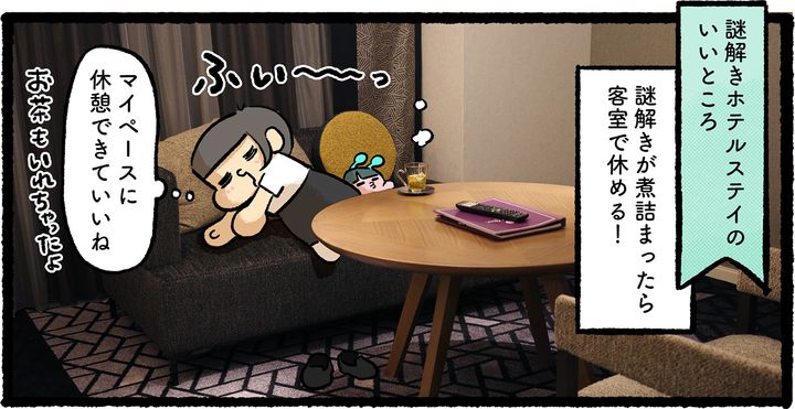 「謎解きってほぼスポーツなので(※個人的な意見です)、意外と疲れるんですよね。謎解きゲームの最中にこんなにしっかり休憩できるのは珍しい! 私は備え付けのお茶セットであったかい煎茶を飲んじゃいました。謎解き中とは思えないリラックス感…」(カメダ)