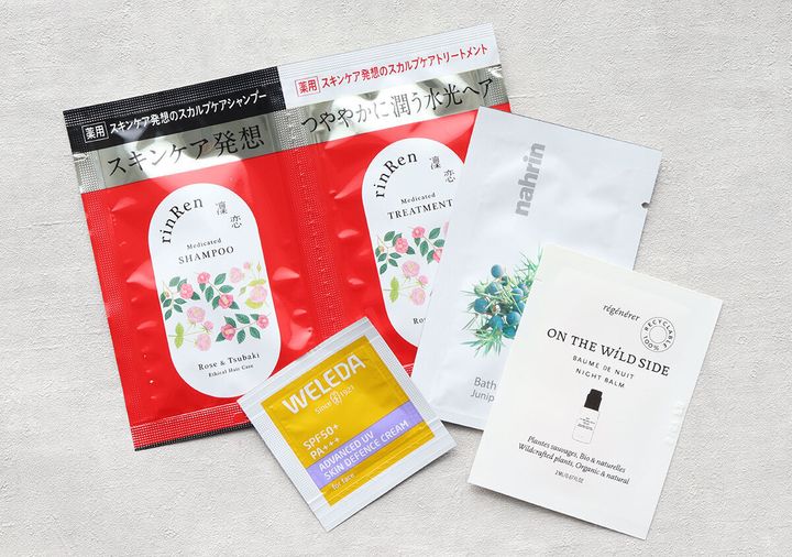 さらに、福本敦子さんがセレクトした巡りをサポートするナチュラルコスメ4種のサンプル(リンレン ローズ&ツバキ シャンプー&ヘアトリートメント 各8mL/ナリン バスエッセンス ジュニパー 5mL/オン ザ ワイルド サイド ナイトバーム 2mL/ヴェレダ エーデルワイス UVバリアクリーム 0.8mL)も同梱。