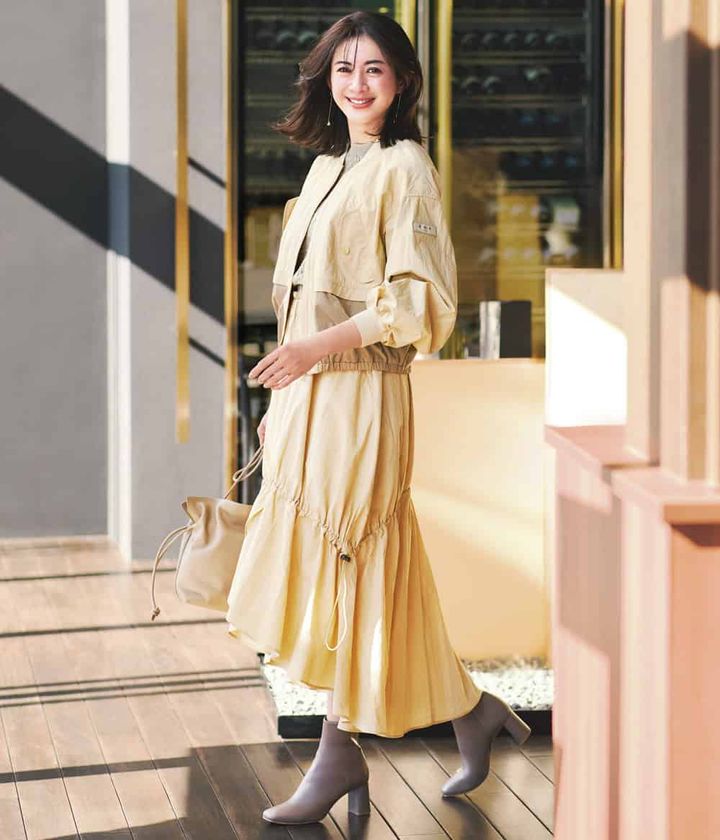 はじめましての機会が増える季節。印象に残りやすいアウターこそ、今の空気が感じられる一枚で着こなしを更新したいもの。ラフな素材感のMA-1ジャケットはペールイエロー寄りのやわらかなベージュで親近感たっぷり。羽織りやすいショート丈は、パンツはもちろんフェミニンなスカートとも好相性。