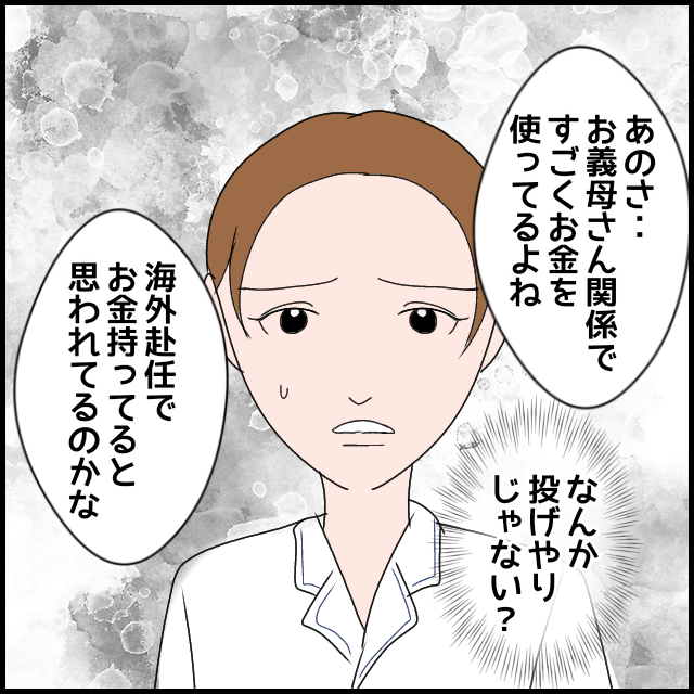 海外で出産した主人公・うみの義母は、すべての支払いを押し付けるたかり屋で、育児についても嫌味ばかり。さらに夫は、そんな義母の言いなりだった。