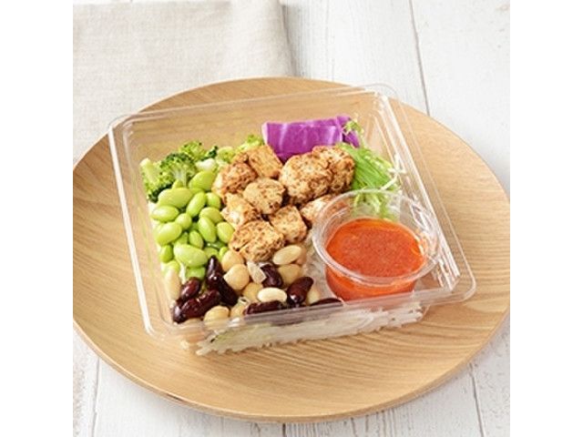 スパイシーな鶏むね肉のチリチキンと4種の豆が入った、トマトベースのドレッシングをかけて食べる、たんぱく質たっぷりのサラダです。 ※1日当たりの野菜摂取目標量(350g)の1/3が摂取できます。(厚生労働省「健康日本21<第三次>」より)
