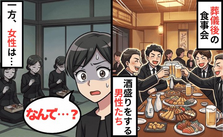 さらに衝撃だったのは葬儀後の食事会です。なんと夫を含む男性陣は広い会場に通され、天ぷらや刺身などの豪華な食事でお酒を飲む大宴会。一方、私や義母を含む女性陣は別室へ通され、配られたのは「冷たいお弁当」のみ。しかも「飲み物は各自で自販機で買って」という、あまりにも露骨な待遇の差でした。