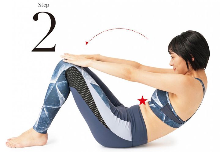 上体を起こしてひざにタッチすることで腹直筋を鍛え、ペタンコ腹に。