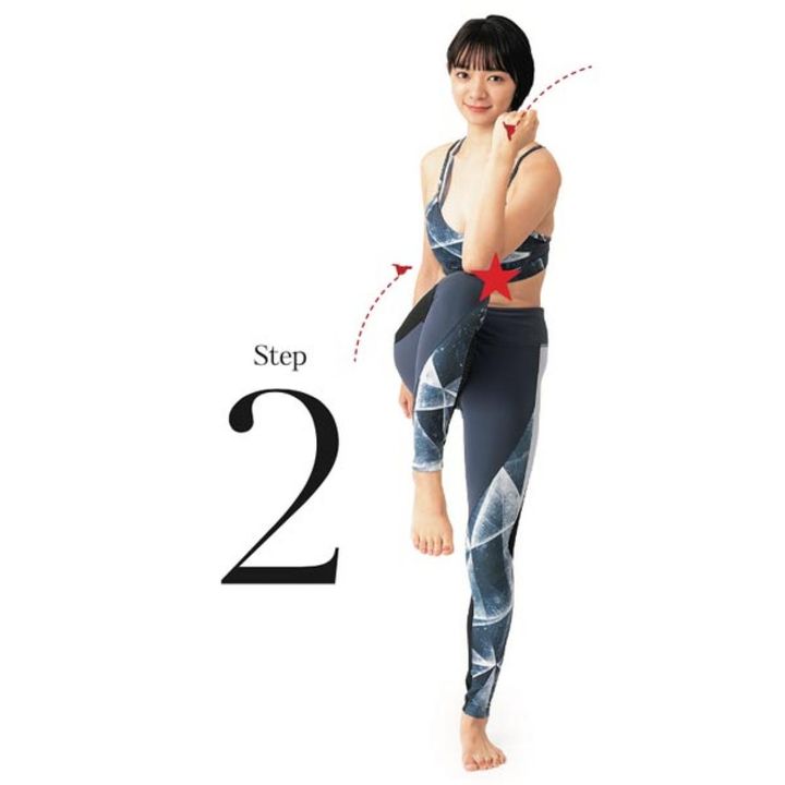 脚を肩幅に開いて立ち、左ひじを曲げて腕を上げ、手を軽く握ります。右のかかとを軽く上げます。