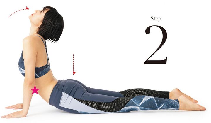 下半身を床につけ、上半身を反らせて20秒キープ。首からお腹をゆるやかな逆アーチにすることで、腹直筋が伸びるのを感じましょう。