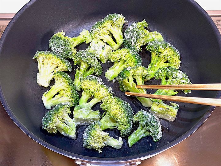 4. フライパンにこめ油を熱し、3のブロッコリーを弱火で10〜15分ほど焼く。