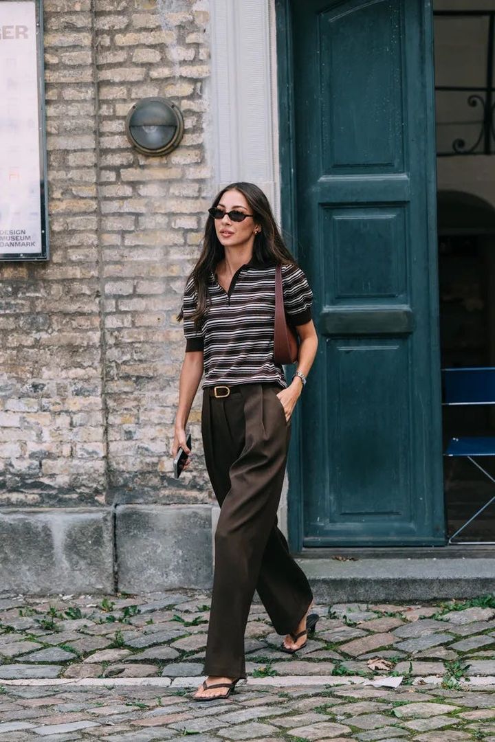 ポロトップスとワイドパンツのきれいめなスタイルに、あえてフリップフロップを合わせてノンシャランに。端正さとリラックス感の程よいミックスが、今の気分を映し出す。