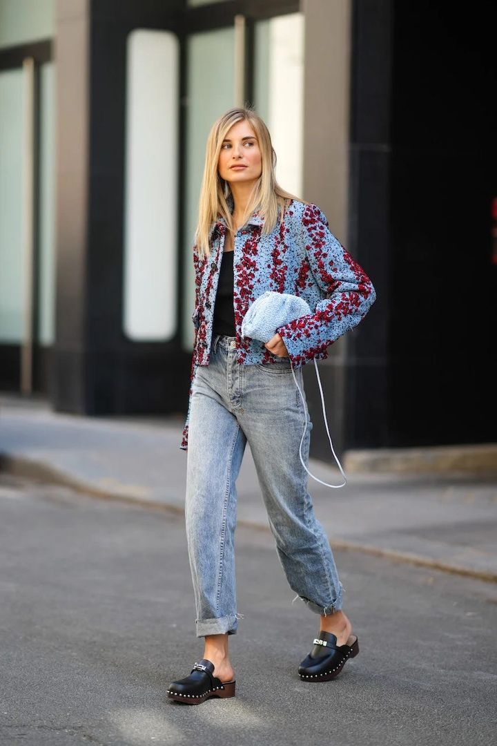 フラワーモチーフのジャケットにデニムを合わせた着こなしに、クロッグで足元に重心を。ロールアップした裾から足首を見せることで、クロッグの存在感をより引き立てて。