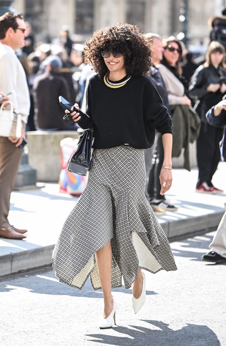 コンパクトなニットにボリュームのあるチェック柄スカートをセットして、シンプルなトップスとのコントラストでスタイリングにメリハリをプラス。足元はVネックヒールで主張を抑え、バランスよくまとめて。