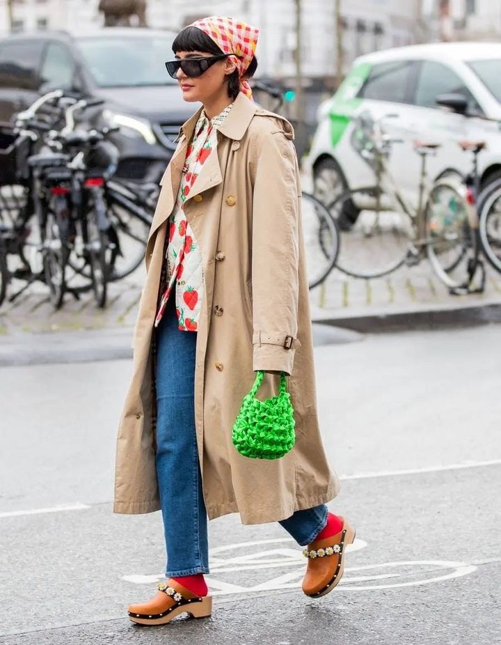 トレンチコートにデニムを合わせたベーシックな着こなしに、柄シャツやスカーフで遊びをプラス。クロッグに赤ソックスを合わせることで、色とリズムを加え、スタイリング全体をチアアップ。
