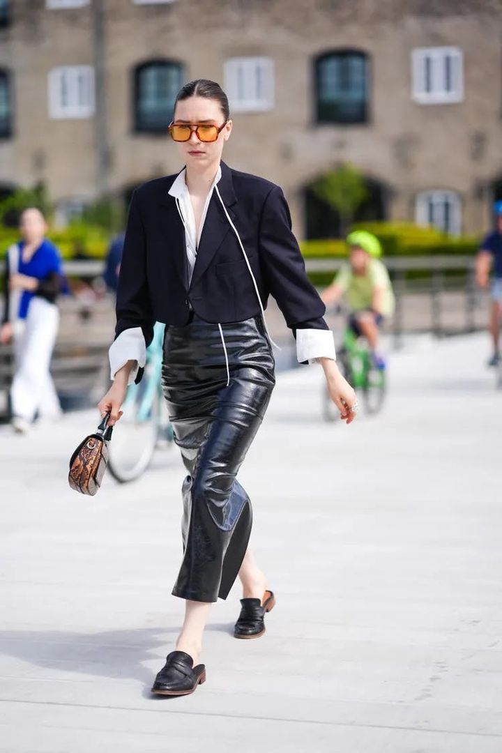 白シャツに黒のスカートを合わせたミニマルな着こなしに、バックレスローファーを合わせて足元に変化を。レザーの質感やアクセサリーでエッジを利かせながら、足元で日常的なニュアンスを添えて。
