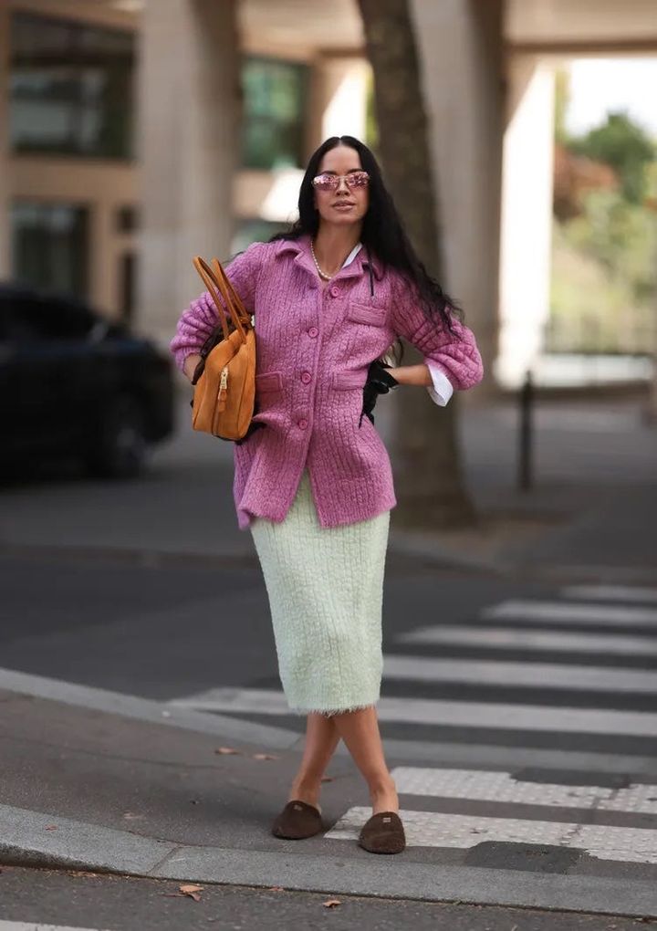 ピンクのジャケットにミントグリーンのスカートを合わせた、やわらかなカラースタイリング。ブラウンのバックレスローファーを合わせることで、甘さをほどよくコントロール。