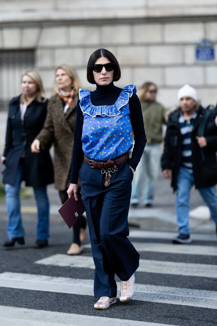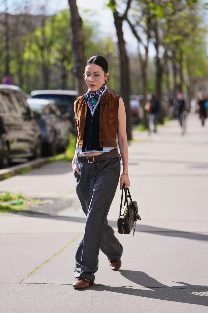 ベストにシャツやスカーフを重ねた着こなしに、ワイドパンツをセット。足元にロープロファイルスニーカーを合わせることで、かしこまりすぎず、ほどよく抜け感のあるバランスに仕上げて。