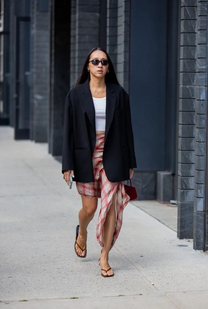 オーバーサイズのジャケットにラップスカートを合わせたスタイリングを、フリップフロップで軽やかに。足元にリラックス感を添えることで、きれいにまとまりすぎないバランスへと導いて。