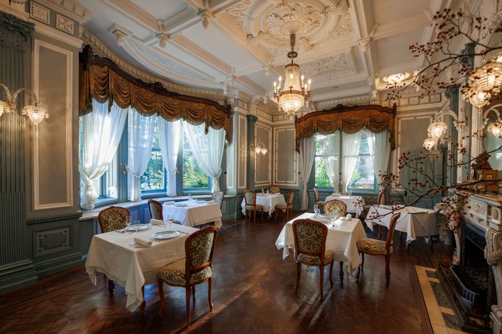 イギリス・ヴィクトリア朝のネオ・クラシック様式の装飾が見事なダイニングルームは、写真のフレンチレストラン「ル シェーヌ」に。「バカラ」のシャンデリアがきらめき、往時の気品が今も漂う。ロココ様式の優雅な迎賓の間は、現在アフタヌーンティー専用の部屋として使われている。