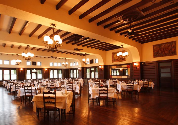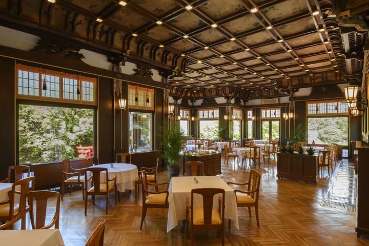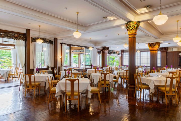 本館のメインダイニングルーム(写真)を彩る華やかな欄間や、長きにわたり使われてきた回転扉、創始者・金谷善一郎が勤めていた日光東照宮にある霊獣・動物彫刻に似た、想像上の象の彫刻飾りもぜひ見ておきたい。