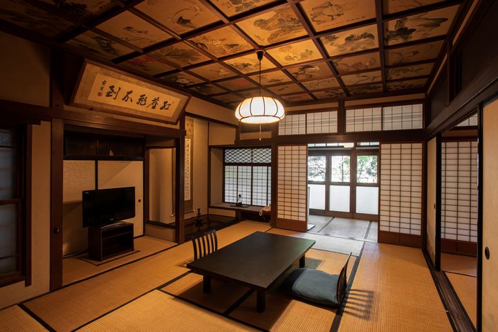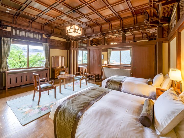 写真の「萬翠楼 15号室」は花鳥風月を描いた48点の天井画が有名。逗留した伊藤博文の書がかかる。山桜の木が、自然な形状をそのまま生かして柱として据えられているのも味わい深い。この「15号室」は2026年夏より、ヒストリック・カフェ&バーとして宿泊客以外も訪れることができるように。「萬翠楼」「金泉楼」それぞれに現在も泊まれる客室がある。
