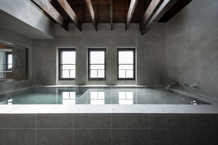 もともとスタッフルームで、デザインの特徴がなく文化財としての改修制限がゆるかった地下室は、約100年前からの梁が見え、自然光の降り注ぐ広い浴室を設けて大きくつくり変えた。