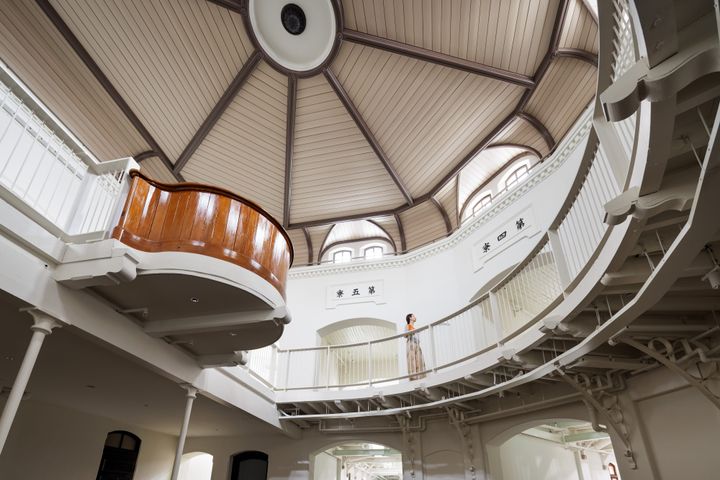ホテルは、「ハヴィランドシステム」と呼ばれる中央看守所から放射線状に並ぶ舎房の棟を宿泊棟に。写真は中央看守所を見上げたところで、構造の端正な美しさが印象深い。