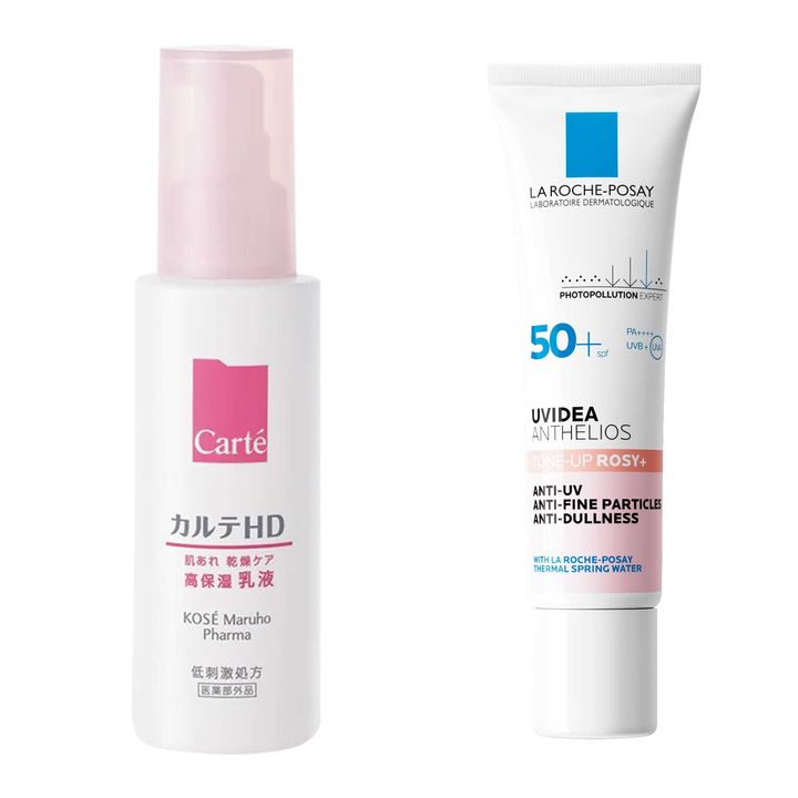 左から:ヘパリン類似物質HDを配合し、うるおいを保持。カルテHD モイスチュア エマルジョン[医薬部外品] 120ml ¥2,090〈編集部調べ〉()、日中のくすみケアも。敏感な肌にも使用でできるUV。UVイデア XL プロテクショントーンアップ ローズ+ SPF50+・PA++++ 30ml ¥3,960()