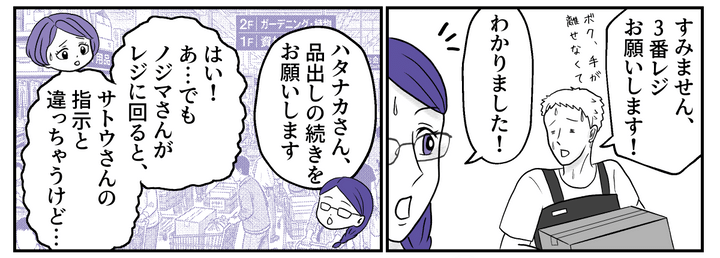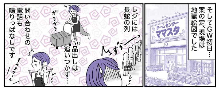 GW初日のホームセンターは、大勢のお客様とパートの人手不足で大忙しでした。そんななか休暇を取っているはずのサトウさんが、私たちが配置換えしたことに怒って電話をかけてきました。ミゾグチさんが密告したのでしょう。他のパートたちが自分の言いなりに動いていないと気が済まないなんて……。お客様を待たせているのに、あまりの理不尽さにウンザリしてしまいます。