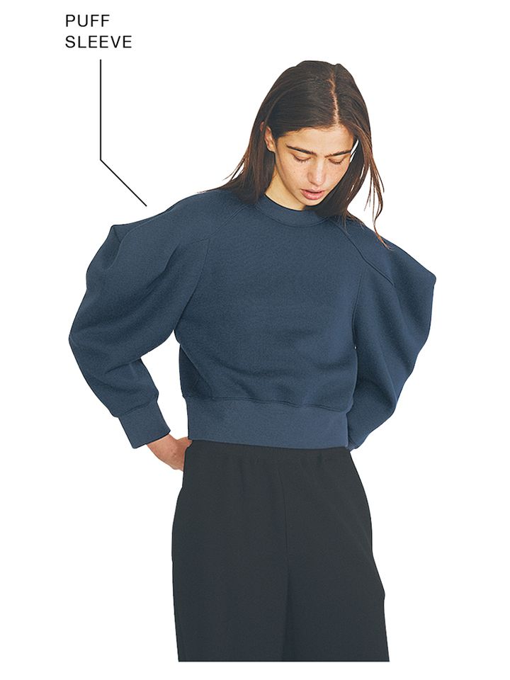 ネイビーパワーショルダースエット/バナナ・リパブリック ボリューミィなそでに反して、コンパクトなウエストラインで膨張見えを回避。