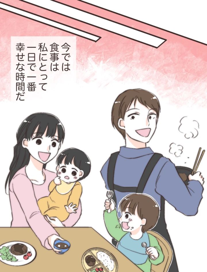 数年後、家族が増えた私たち。料理の腕を上げた充は、レパートリーも増えて夕食作りを担当してくれることも。ダメ出しばかりされて料理が嫌いになってしまいそうになったこともあったけれど、今では食事は私にとって一日で一番幸せな時間です。これからも家族みんなで美味しいご飯を食べながら楽しく食卓を囲んでいきたいです。
