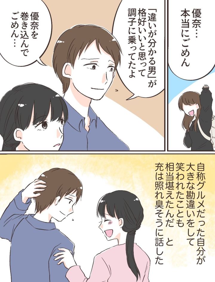 みのりが帰った後、充は「優奈・・本当にごめん。『違いが分かる男』が格好いいと思って調子に乗ってたよ。優奈を巻き込んでごめん・・」と改めて謝ってくれ、自称グルメだった自分が大きな勘違いをして笑われたことも相当堪えたんだ、と照れ臭そうにしながらも正直に話してくれました。