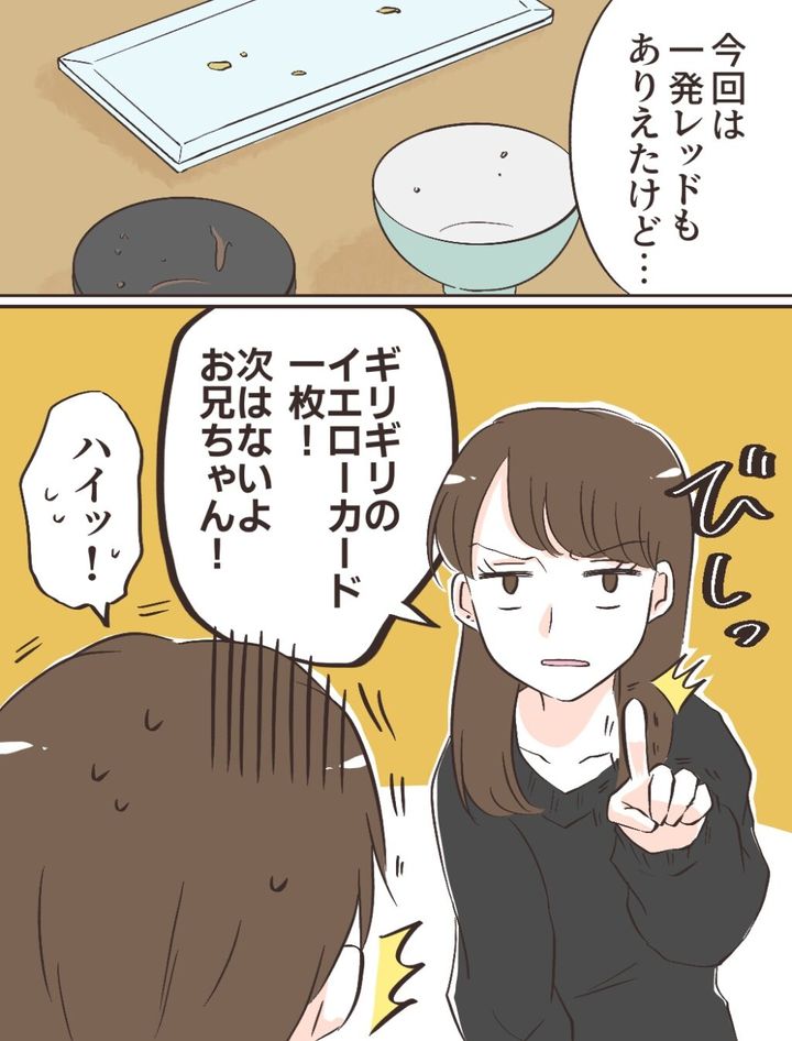 朝食を食べ終えたみのりちゃんは、「今回は一発レッドもあり得たけど・・ギリギリのイエローカード一枚!次はないよ、お兄ちゃん!」とびしっと釘を刺し、充は「ハイッ!」とたじたじ。